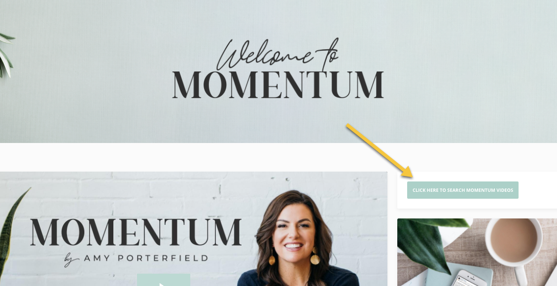 To get started, go to your Momentum members area dashboard and click on the button “CLICK HERE TO SEARCH MOMENTUM VIDEOS”. Search by typing in your name or keywords in the search bar and it will pull from all of Amy’s past Facebook lives.